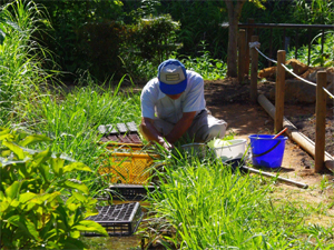 | ブルーベリー畑でパパと。パパの丁寧なお世話のおかげで、収穫が楽しめています。 |